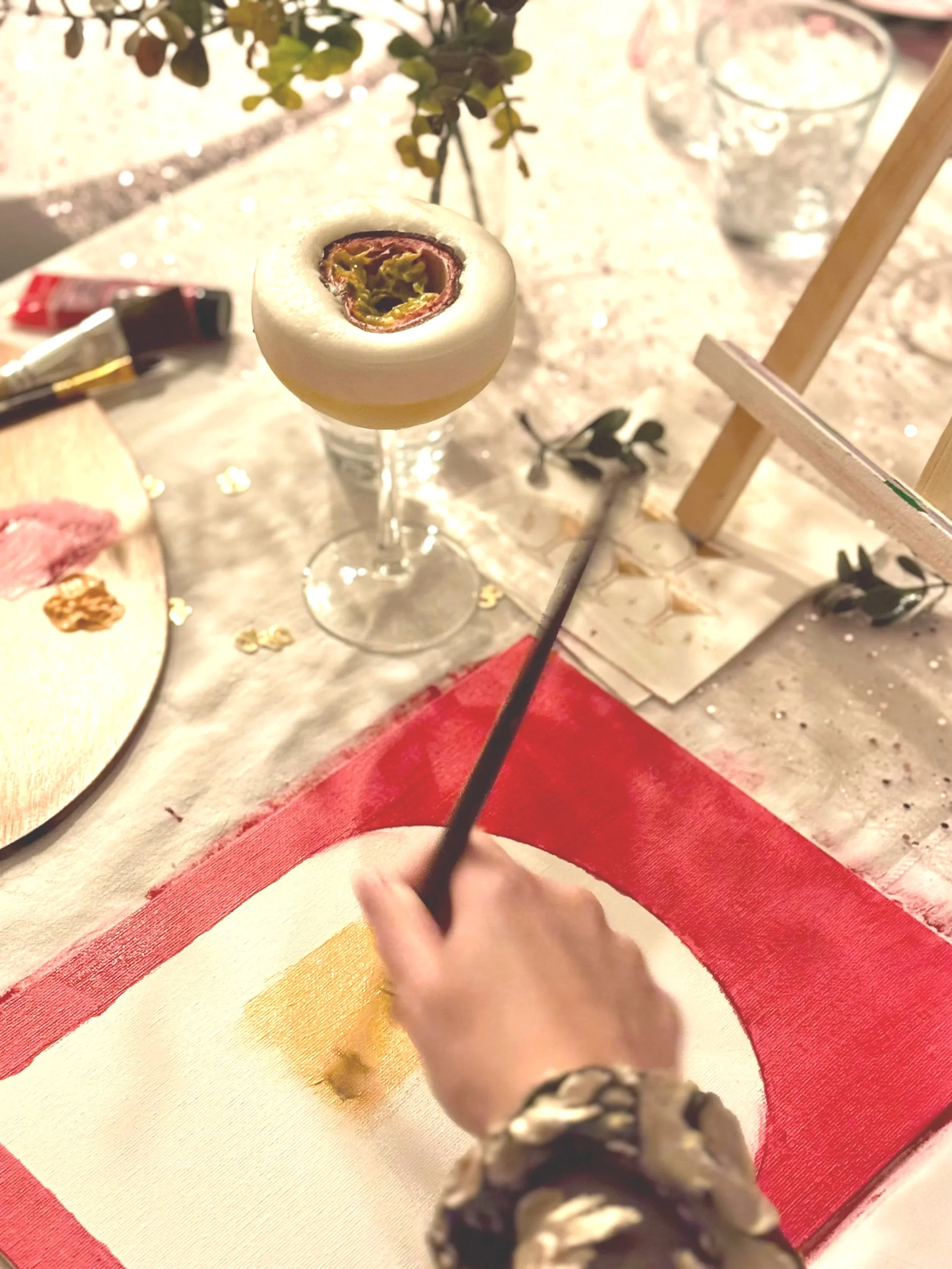 Jullie hoeven alleen maar aanwezig te zijn, wij regelen de rest. Van schildermaterialen en doeken tot mocktails en styling: alles wordt verzorgd. We bouwen de tafel op, creëren een warme sfeer en zorgen dat alles klopt. Of we nu bij jullie thuis komen, op een geboekte locatie of in onze ruimte in Noordwijk, wij nemen alles mee wat nodig is voor een ontspannen en stijlvolle ervaring. Na afloop ruimen we alles weer netjes op, zodat jullie alleen nog maar hoeven na te genieten.