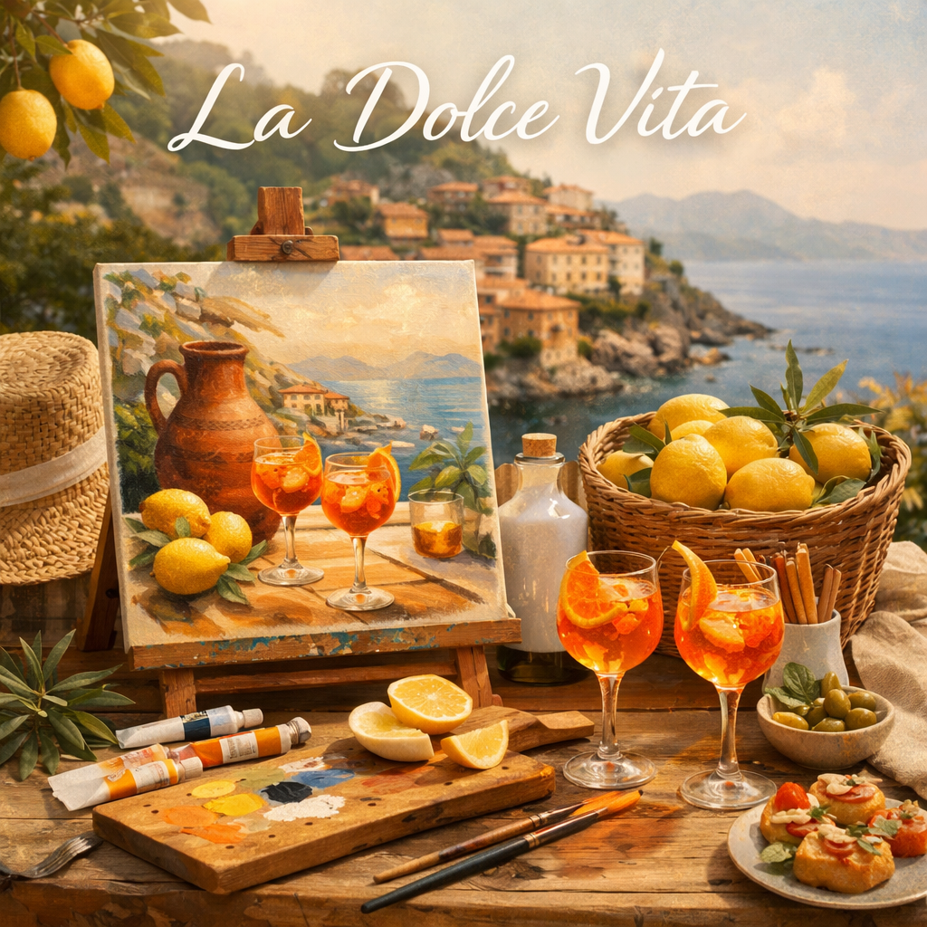 Een schilderevent in mediterrane sferen. Denk aan citroenen, Aperol Spritz en het gevoel van een lange avond aan tafel in Italië.